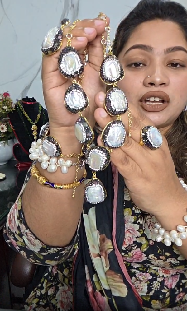 💎 প্রিমিয়াম ম্যাটেরিয়াল: এই সেটটিতে মাঝখানে রাজকীয় 'মাদার পার্ল' (Mother of Pearl) ব্যবহার করা হয়েছে। চারপাশে নিখুঁতভাবে বসানো হয়েছে ব্ল্যাক রিয়েল স্টোন, ব্ল্যাক জারকান এবং মার্বেল স্টোন।